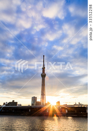隅田川テラスから眺める 日の出と東京スカイツリー