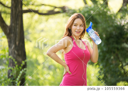 A beautiful woman holding a water bottle in the park while listening to music during morning exercise