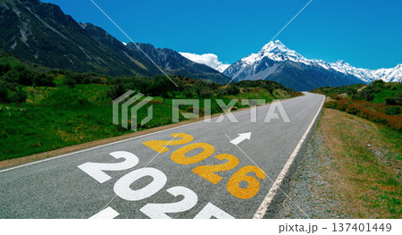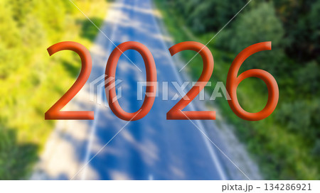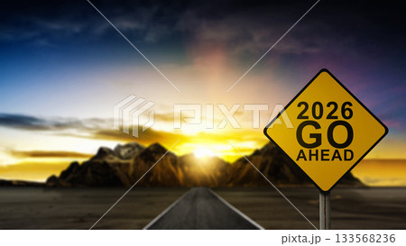 Street toward the hills with a yellow signboard with a greeting of 2026 Go Ahead. Happy New Year concept or Celebration