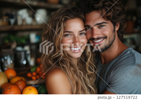 A delighted couple shares laughter while preparing breakfast, feeling carefree and blissful