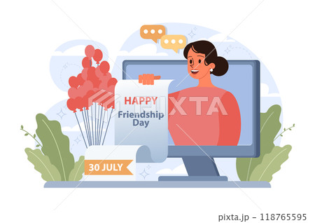 International friendship day. Cheerful female character celebrating a holiday of togetherness, unity and support. Woman holding a festive banner. Flat vector illustration