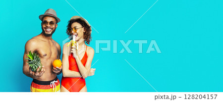 Happy African American lovers enjoying summer holiday together, eating tropical fruits, isolated on blue studio background, panorama with copy space