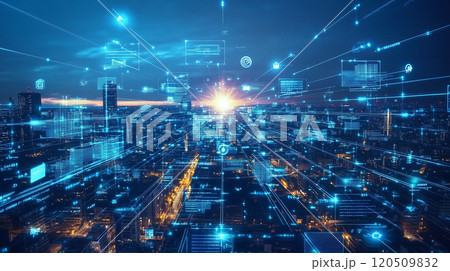 Glowing Hexagonal Shapes Representing Digital Firewall Concept Over Cityscape Background