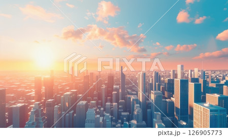 A vibrant city skyline at sunrise, showcasing skyscrapers beneath a colorful sky, perfect for urban and travel themes.