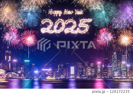 Happy new year 2025 firework over cityscape building near sea at night time celebration