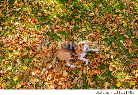 Beagle dog lying on vibrant green grass covered with autumn leaves.