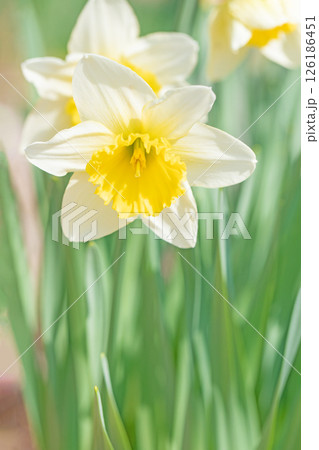 家の周りの草花 四季の色々 春の花壇に白い清楚で優美なラッパスイセンの花が咲きました