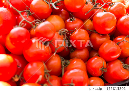 lots of tomatoes on a branch on counter