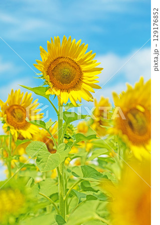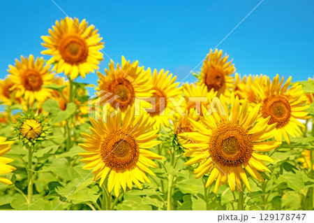家の周りの草花 四季の色々 農園の花畑に美しい大輪のひまわりの花が青空に向かって咲いています