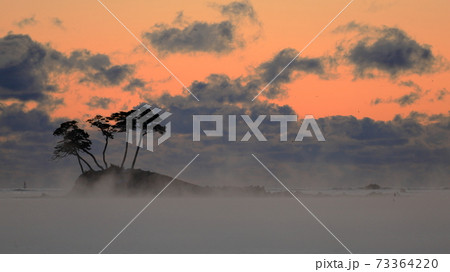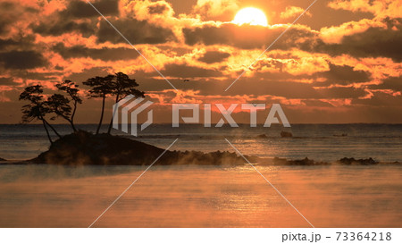 気仙沼市お伊勢浜から見る明戸の島と気嵐の朝