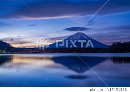 「世界文化遺産」富士山と早朝の月 / 静岡県富士見市、田貫湖より展望 / 静岡県富士見市、田貫湖より