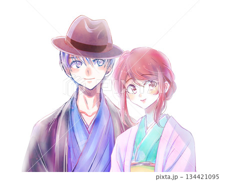 寄り添う着物を着た男女 帽子 恋愛 バストアップ
