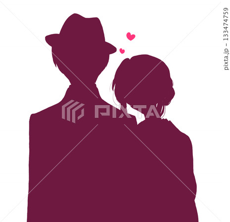 寄り添う着物を着た男女 帽子 恋愛 バストアップ シルエット