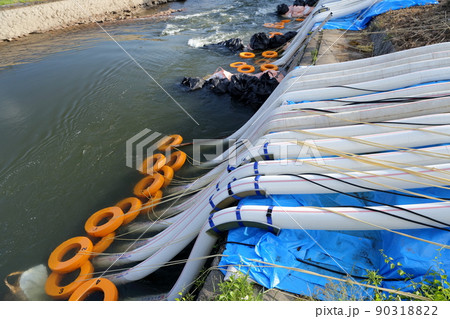 仮設されたくみ上げ用ホース(明治用水頭首工、漏水問題 愛知県 豊田市)