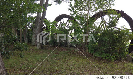 日が陰った三連水車の風景