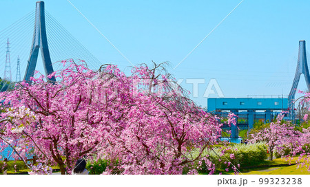 満開のしだれ桜と豊田アローズブリッジ