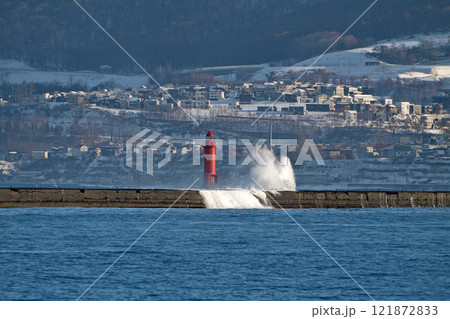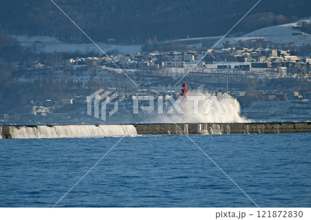 波浪警報が出された時の小樽港北防波堤と小樽港北副防波堤灯台