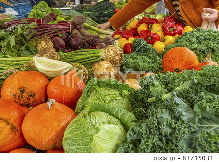 Various colorful fresh organic vegetables at a farmers market, tomatoes, cucumbers, onions, cabbage
