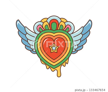 Cartoon vintage 70s groovy winged heart sticker or symbol. Cartoon isolated groovy sticker, 70s 80s hippie vector tag. Vintage funky label or patch with colorful heart, star and wings
