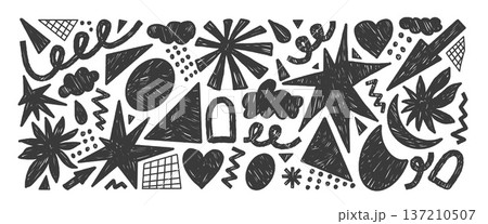 Doodle kids chalk elements abstract shapes. Figures with charcoal texture. Geometric figures, stars, arrow element. Playful scribble stickers pencil y2k. Vector graphics for modern collage isolated