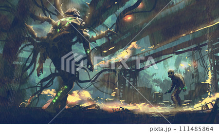 A cartoon sad octopus wearing a construction helmet and a bandana, with a cyborg eye and a baseball bat. Illustration for fantasy, science fiction and adventure comics