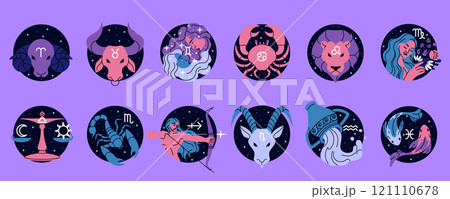 12 zodiac signs Scorpio, Pisces and Virgo, Lion. Abstract Aries and Aquarius. Calendar star. Magic shape. Avatar horoscope constellation. Esoteric contemporary isolated elements. Vector cartoon icon