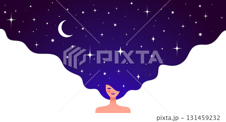 Dream universe flows through woman figure, girl with cosmic night sky in hair. Woman dream vision shines, girl in flat style, universe dream surrounds woman girl cosmos. Vector Illustration