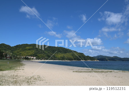 秋空と白砂の「片添ヶ浜海岸公園」(山口県周防大島町)