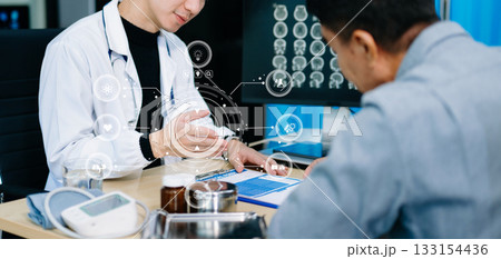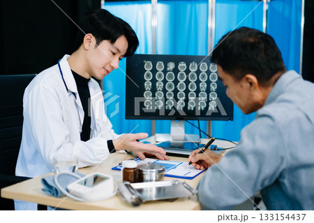 Doctor explains MRI brain scan while patient signs treatment form. hospital service scenes.