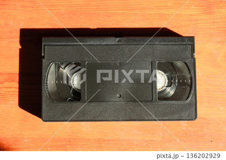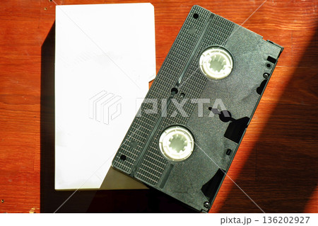 黒いVHSビデオテープの真俯瞰カット 懐かしの映像メディアと木目の背景