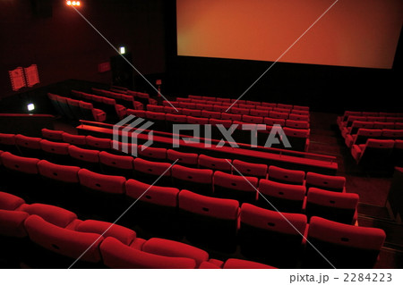 映画館のスクリーンと赤い座席シート