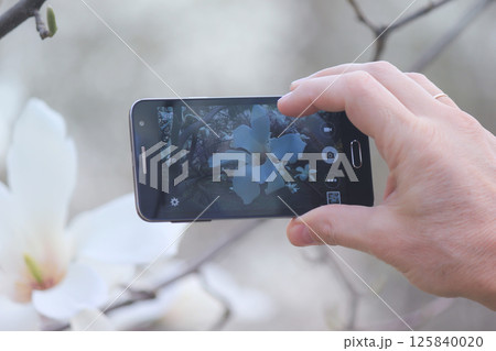 The process of photographing a white magnolia in a garden.