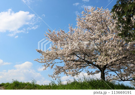 堤防に見事に咲く桜の花 気持ち良い青空 思川河川の風景