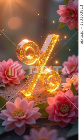 Neon glowing gold percentage sign against background of pink blooming, glitter and petals. Spring sale and discounts, March 8, Easter, Women's Day banner, flyer with copy space. AI generated