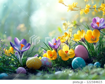 A vibrant Easter garden scene with colorful blooming flowers and Easter eggs in springtime.