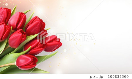 Bouquet of fresh red tulips on white pink background with blur with copy space. AI-generated content.