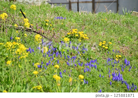早春の日差しに照らされてたくさんの花が咲く