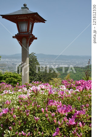 春の善峯寺 けいしょう殿付近のツツジと京都市内の景色