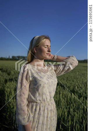 portrait of a young blonde woman in a pastel chiffon dress in a green wheat field