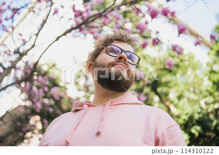Springtime concept. Bearded man on background bloom of magnolia. Spring beauty season. Botany and nature. Happy spring concept. Hipster guy enjoy blossom aroma.