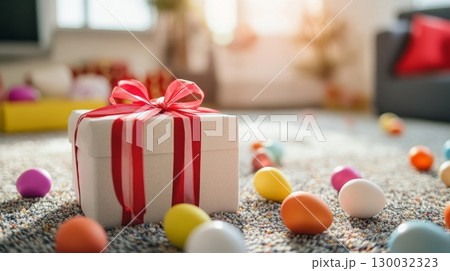 Colorful gift box with red ribbon surrounded by Easter eggs in cozy living room