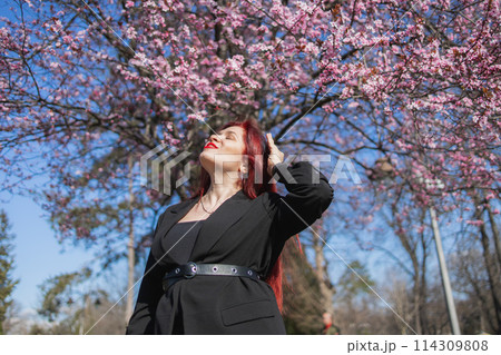 Fashion outdoor photo of beautiful woman with red curly hair in elegant suit posing in spring flowering park with blooming cherry tree. Copy space and empty place for advertising text