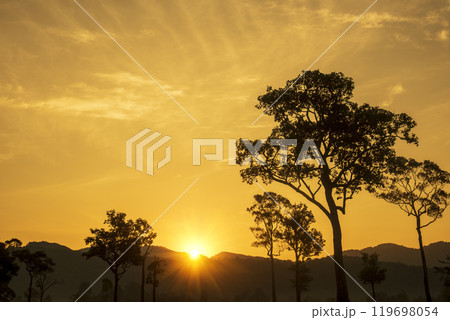 Golden sunshine sky tropical tree fields in sunny morning. Silhouette tree gold dawn mountain in spring season. Sustainable scenic meadow misty fog forest in countryside. Amazing landscape greenery