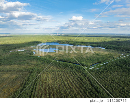 Big lake with green shores in bright sun light and city on horizon, aerial landscape. Recreation concept. Aerial view