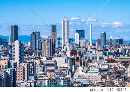日本の東京都市景観 山々が見える珍景…池袋副都心。サンシャイン60やタワーマンションなどを望む