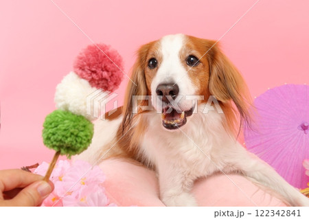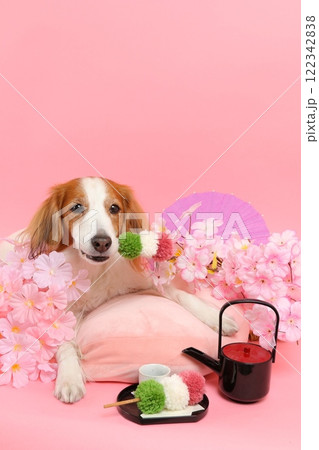 桜と和菓子で彩られた笑顔の犬の和風ポートレート