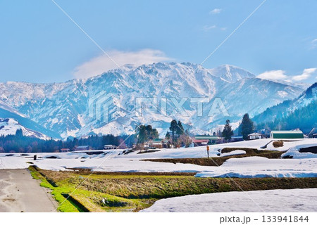 早春残雪の八海山風景