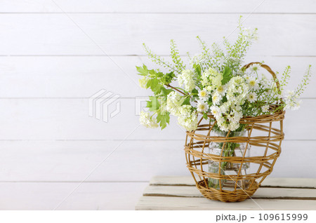 室内の籠に生けた春の花、春の花のフラワーアレンジメント
