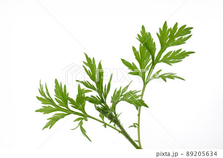 白背景にフレッシュな蓬の葉、よもぎ、餅草、ヨモギの葉の切り抜き素材、薬草