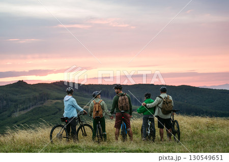 Family standing with bicycles at sunset in mountains. Cycling trip during autumn day.